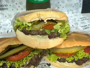 Pão, hambúrguer 150g,tiras de bacon,frango,calabresa,queijo,alface,tomate,milho,ervilha,pepino e maionese caseira. Lanche aberto , serve até duas pessoas.