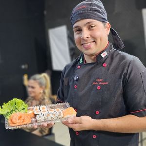 5 Sashimis de Salmão, 5 Sashimis de Peixe branco, 5 Uramakis Philadelphia, 5 Hossomakis Skin,5 Uramakis hot Fish, 4 Joy Maracujá e 6 Hots Philadelphia.