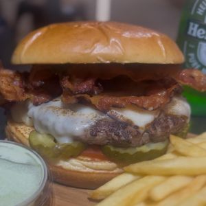 Pão selado na chapa, hambúrguer, Queijo gratinado, picles, molho barbecue, geleia de pimenta, maiônese defumada e aquele bacon em tiras que faz creque creque na boca!! Acompanha molho verde casa.
