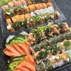 5 Root rool, 5 dragons, 5 hossomake salmão, 5 uramake de kane empanado.