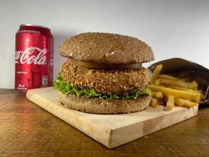 Burger empanado feito de grão de bico recheado com queijo, alface, tomate e cebola roxa, maionese verde no pão australiano.