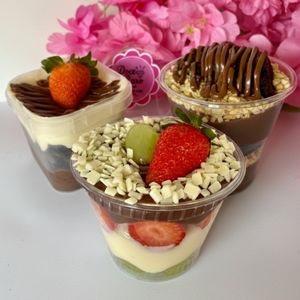 Mini pudim+recheio de leite Ninho+brownie e morangos frescos 250ml.