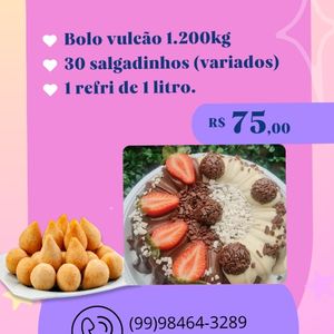 Bolo vulcão 1kg massa chocolate (cobertura ninho e brigadeiro),Serve ate 7 fatias. 30 salgadinhos sortidos,refrigerante de 1L. Preparo em até 1h:30m