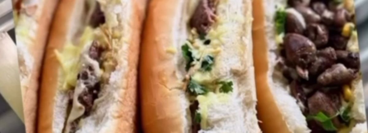 Pão de dog, maionese caseira, carne de rês acebolada na chapa, tomate picado, queijo mussarela e batata palha.