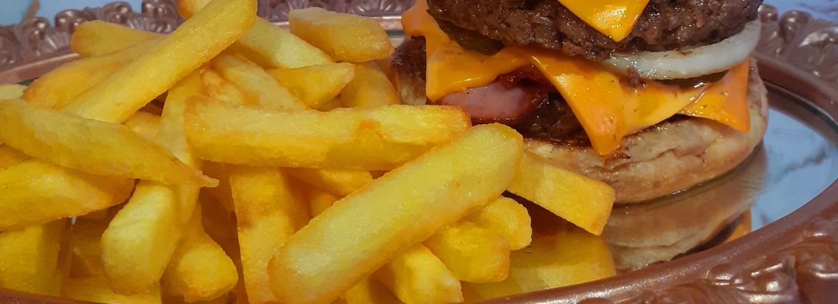 Pão brioche, 2 carnes de 130 gramas cada,cebola,picles, queijo cheddar ou queijo prato, bacon e o molho de sua preferência.