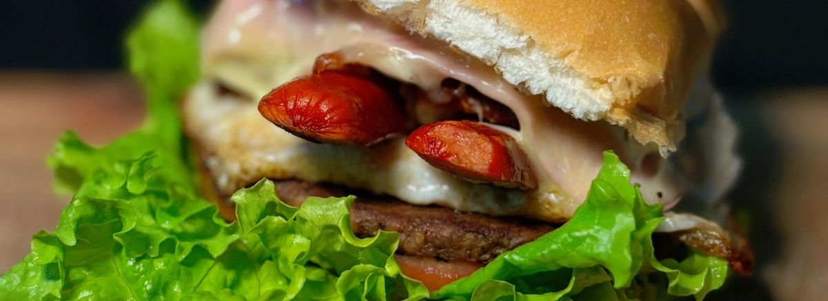 Pão de hambúrguer(ou baguete), 2 hambúrguer, bacon, salsicha, presunto, queijo, ovo, alface e tomate cebola roxa