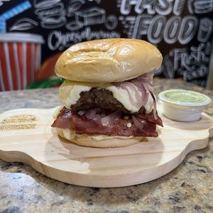 Pão de brioche, blend 120g, bacon, cheddar pasta, cebola roxa
