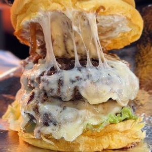 2 blend(bife) costela 180gr Pão de batata Queijo mussarela Cebola caramelizada Alface, tomate, pepino e maionese verde da casa