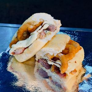 Pão estilo cervejinha Maionese da casa Geleia de pimenta mr. Pink(opcional) Carne da sua escola(carne, misto, frango, coração, frango com bacon) Queijo coalho assado + batata frita 🍟( batata pode escolher fora do pão)