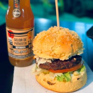 Blend costela assado na brasa Queijo cheddar, pão de brioche, pepino, tomate, alface, maionese da casa e geleia de pimenta mr. Pink