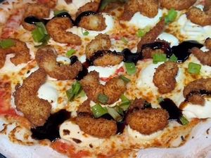 Pizza grande 8 fatias de Camaraõ tropical , com massa fina ,molho de tomate , mussarela , creame chesse , camaraõ empanado, molho tare ,cebolinha e oegano