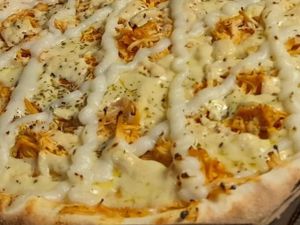 Pizza Grande 8 fatias de frango com Doritos , com massa fina ,molho de tomate ,mussarella , frango , cheddar , Doritos , e oregano