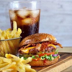 Pão macio, hambúrguer suculento de carne bovina, queijo derretido, alface fresca, tomate. Acompanhando de batata frita e refrigerante de 200ml