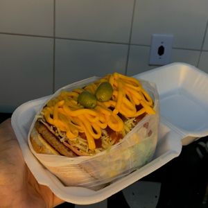 Pão, 2 carnes, 2 queijos, 2 presuntos, 2 ovos, calabresa, bacon, salada, milho, ervilha, passas, queijo ralado, batata palha, azeitona, ovo de codorna e molhos.