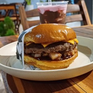 Pão brioche selado na chapa, molho especial ou barbecue, carne suculenta e fatias de cheddar.