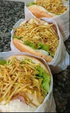 Pão de Hambúrguer,carne,ovo, queijo ,alface,tomate, Milho e Batata Palha