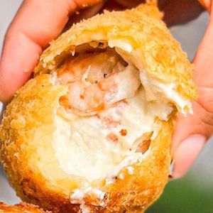 Massa levinha, empanada na panko, recheada com filé de camarão e o toque cremoso do cream cheese.