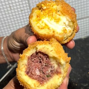 Massa levinha, empanada na panko, com recheio de carne seca desfiada e saborosa.