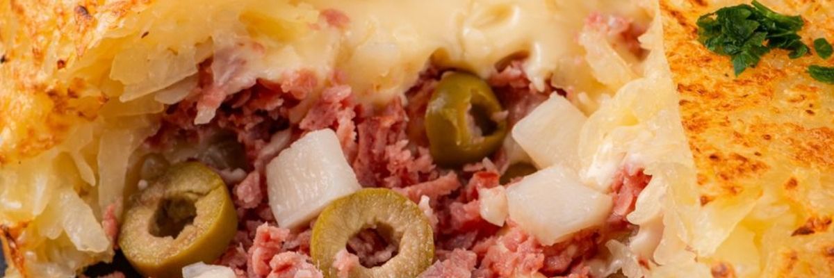 Batata ralada recheada com calabresa ralada, palmito, milho, azeitonas, mussarela e queijo escolhido (catupiry, cheddar ou cream chesse).