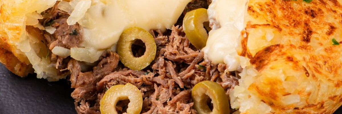 Batata ralada recheada com costela, azeitonas, mussarela e queijo escolhido (catupiry, cheddar ou cream chesse).