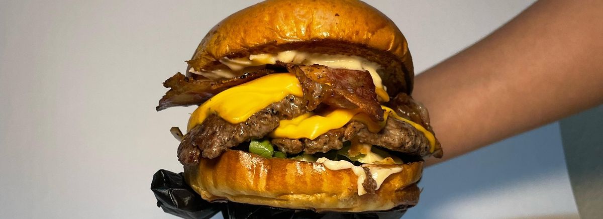 Pão Brioche, duplo smash de carne bovina, bacon, cheddar, cebola caramelizada, alface americana e maionese da casa.