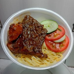 Com uma fatia de carne Acompanha arroz, macarrão, feijão, farofa e salada 😋