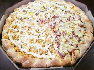 Molho, mussarela, Catupiry, calabresa, bacon, batata palha e orégano
