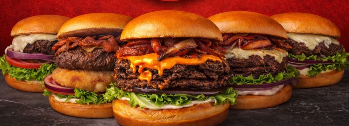 Pão, molho especial, hamburguer 180g, Steak frito, alface, tomate, cebola roxa, bacon e mussarela