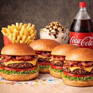 4 burguer bacon 1 fritas crocante 500g 1 refri 2L + Sobremesa
