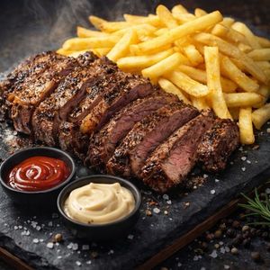 600 gramas de Ancho. 500 gramas de batata frita. Barbecue e maionese. *Escolha o ponto da carne