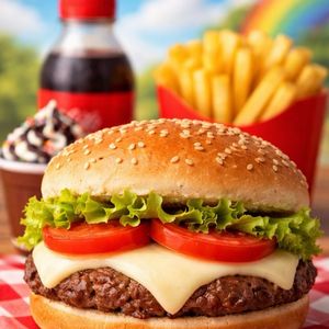 Pão, hambúrguer artesanal 90g, molho da casa, alface, tomate.. Acompanha: Refri 200ml Batata frita E sobremesa disponível do dia