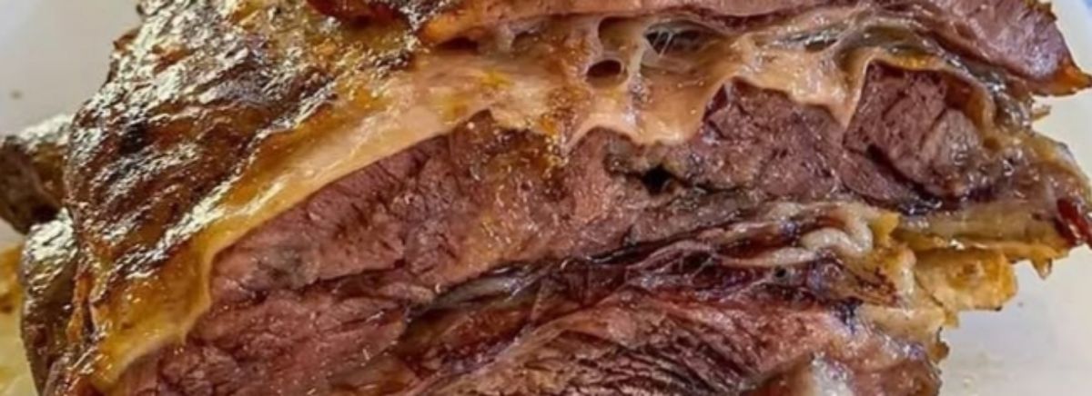 Pão francês bolinha, costela defumada refogada com: tomate, pimentão e cebola com queijo por cima.