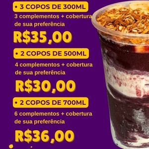 Nosso delicioso açaí artesanal com 14 opções de complementos + 12 opções de coberturas disponíveis. 💜 Uma variedade de adicionais opcionais disponíveis para montar o seu copo. 🤩