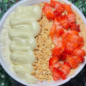 Nosso delicioso açaí com 3 camadas de creme de ninho + 2 camadas de leite em pó + 2 camadas de leite moça + morangos.