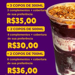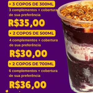 Nosso delicioso açaí artesanal com 12 opções de complementos + 12 opções de coberturas disponíveis. 💜 Uma variedade de adicionais opcionais disponíveis para montar o seu copo. 🤩