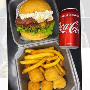 1 hamburger Sublime, 5 mini coxinhas sequinhas e crocantes, Batata P ( 120g) Coca Cola Lata