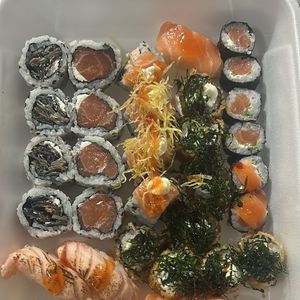 5 niguiri skin 5 niguiri Kani empanado 5 gunkan Alaska 5 uramaki salad 5 uramaki skin 5 uramaki fila 5 hossomaki kapa 5 hossomaki Kani 10 hot fila OBS: Não acompanha descartáveis e molhos! Peça abaixo👇🏼👇🏼