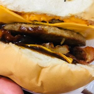 2 carnes bacon 3 queijos cheddar molho cheddar e barbecue dentro . obs lanche sem salada e sem batata palha