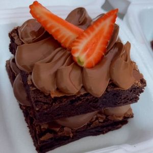 2 fatias de Brownie Recheado com brigadeiro 50% cacau, coberto com uma camada generosa de Nutella finalizado com morangos