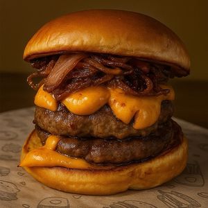 Pão brioche + hambúrguer 100% bovino + cream cheese + cebola caramelizada + bacon crocante triturado.