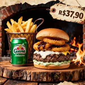 Pão brioche, hambúrguer 100% bovino, catupiry, onion rings, molho barbecue e molho verde!