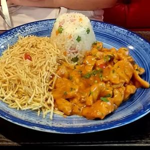 Filé de frango em tiras, regado ao molho. Acompanhado de arroz branco.