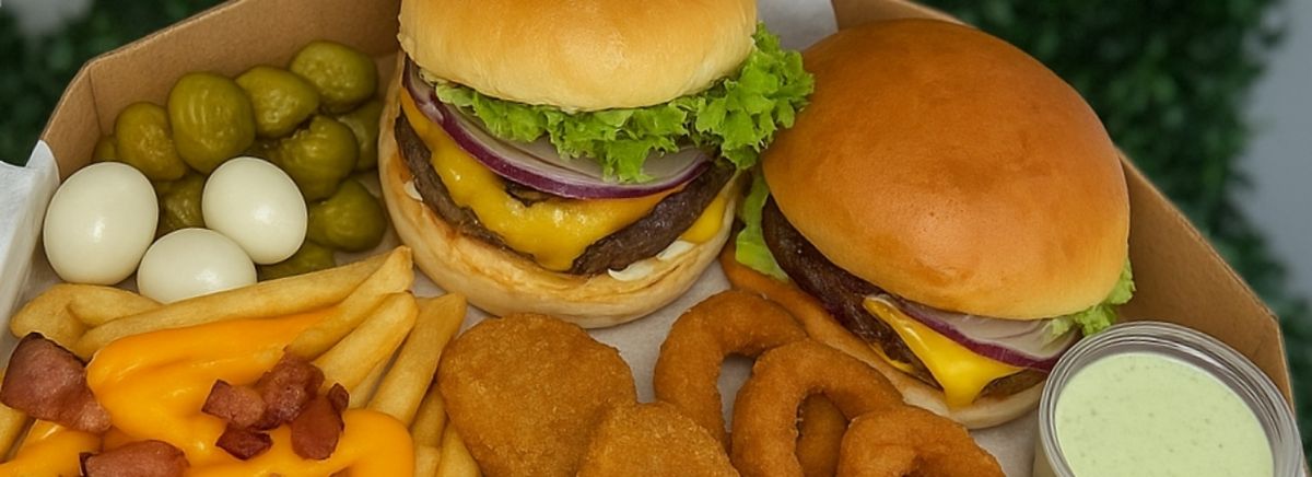 2 Burger carne, fritas com cheddar e bacon, porção de anéis de cebola e nuggets fritos, ovinho de codorna e picles + molho especial +Refrigerante grátis, caixa 30cm...