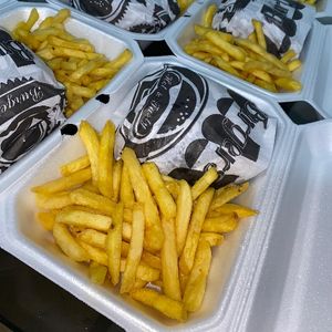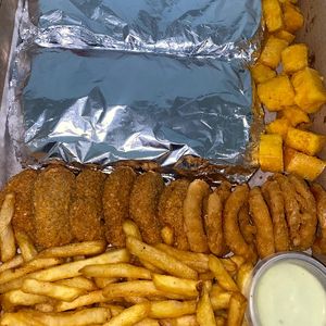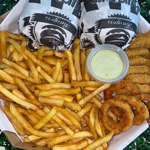 Dois hambúrguer de carne+ porção de fritas+ cebola frita e nuggets +maionese caseira +Refrigerante grátis ,caixa 30cm..
