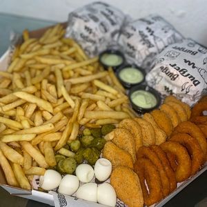 4×Burger +fritas cheddar com bacon +porção de polenta cebola frita e naguets, e ovinho de codornae picles +Refrigerante