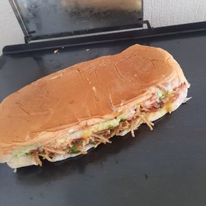 Pão 130g molho especial, maionese caseira verde, alface, queijo ralado, batata palha, milho ervilha,