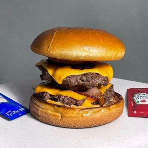 Pão brioche tostado na manteiga, três carnes bovinas artesanais de 100g, três fatias de bacon, três anéis de cebola empanados, 3 fatias de cheddar e nosso delicioso molho da casa.