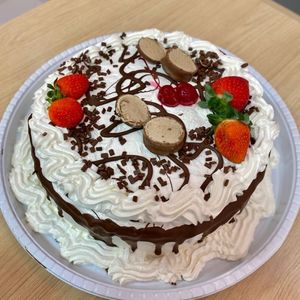 Massa amanteigada, recheio de brigadeiro + baba de moça (brigadeiro branco), cobertura de Chantininho de leite condensado + chocolate, finalizado com cerejas e bombons, serve 10 pessoas