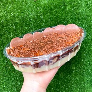 Creme de leite condensado, sonhos de valsa picados, calda de chocolate finalizado com chantilly com calda de chocolate e petala de chocolate nobre. Serve 15 pessoas