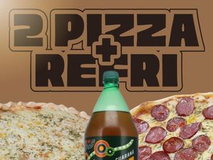 Super Combo Mussarela + Calabresa + Kuat – “Duas pizzas grandes, quentinhas e cheias de queijo + aquele refrigerante geladinho . Combo perfeito pra matar a fome! Pede já Irresistível Pizza de Mussarela! Massa fresquinha e molho caseiro, cobertos por uma generosa camada de mussarela derretida e saborosa. Peça já!